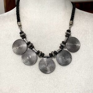 Unleash your inner free spirit with this captivating boho-luxe statement necklace. Five handcrafted oxidized sterling silver spiral discs graduate in size and hang from a soft black silk cord, creating mesmerizing movement with every turn. Richly textured concentric circles catch the light, while tiny silver beads and tribal-inspired spacers add authentic artisan detail.