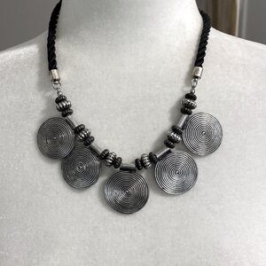 Edgy Rebel Rockstar Silver Coin Bohemian Whimsical Goth Swirl Black Necklace