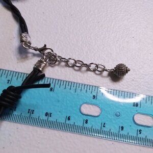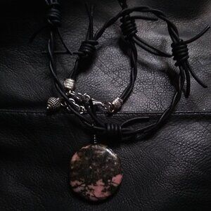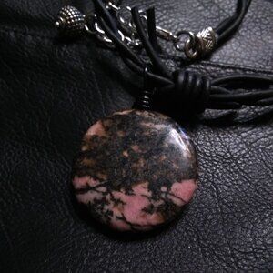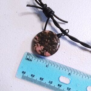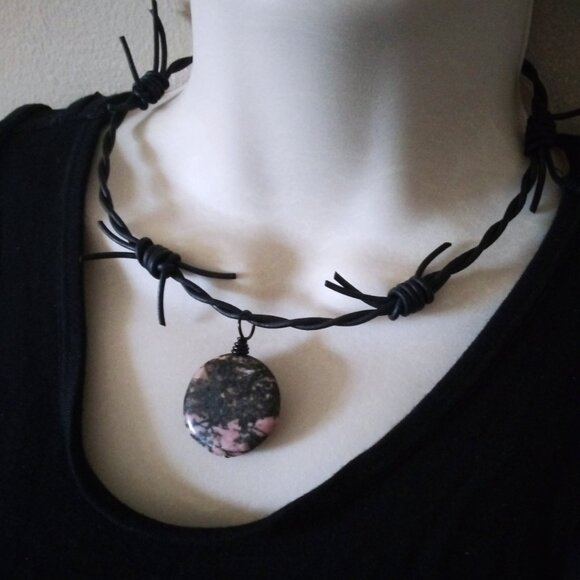 Large black + pink Rhodonite Coin Bead on a edgy and very noticeable black barbwire, real leather, cord.