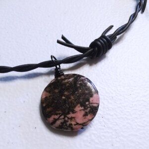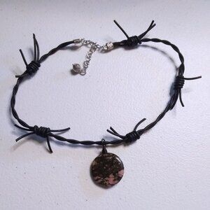 Edgy & Risque`~ Rhodonite Coin on Barbwire Leather Cordage - OOAK Choker 16"