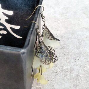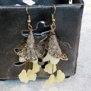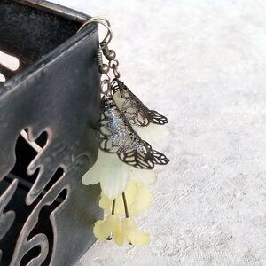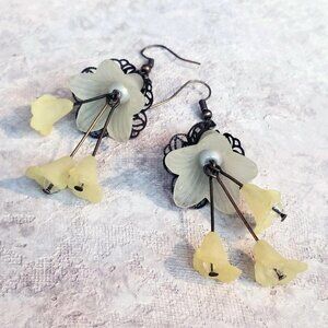 Edgy Shades of Yellow Matte Lucite Flowers Bronze Filigree Victorian Earrings
