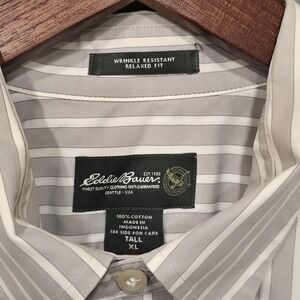 Upgrade your wardrobe with the versatile Edie Bauer Men's Relaxed Fit Button-Up Shirt. Designed for the big and tall man, this size XLT shirt offers a comfortable 54-inch chest size and relaxed fit that's perfect for business, casual wear, or travel. The classic gray striped pattern with a button-down collar adds a touch of timeless style, while 100% cotton woven fabric ensures breathability and easy care. Enjoy features like a chest pocket for convenience and a button closure that complements the shirt's traditional aesthetic. The shirt's wrinkle-resistant quality keeps you looking sharp throughout the day, and its all-season adaptability makes it an essential piece for any collection. Machine washable and crafted with attention to detail, this shirt is ready to become a go-to in your daily rotation.