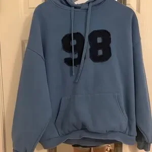 Casual blue hoodie with bold '98' patch. Ideal for everyday wear.