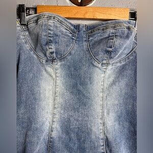 Bodycon fit. Denim fabric. Model wears size S. Model height is 59. Item care: wash with similar colors. 95% Polyester, 5% Spandex.
