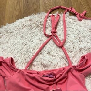 Brand new has never been worn tag is still attached no rips, tears or stains. Pink colored crop top, long sleeves, flared sleeve opening with slit, straight neckline, cropped length and self tie halter detail.