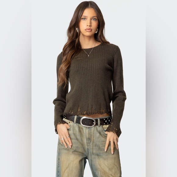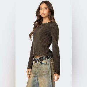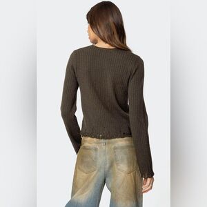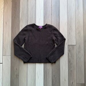 Cozy ribbed knit top in chocolate brown. Features a round neckline. Size: Medium Good Condition Retail Price: $52