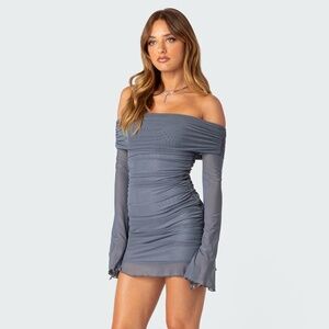 Worn once Mini dress Gathered detailing Fold over neckline Flared sleeves Ruffle hem Polyester, Spandex Model wears size S Model height is 5'7 Item care: Wash with similar color Comment or DM with questions! Open to all offers.