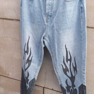 These Jeans are New With Tag Attached. They have a HIGH WAIST, as the inseam (crotch to waist) is 12.5". Otherwise the measurements are 32" waist and Inseam 30", They are marked simply "XL" The jeans are blue with a distinctive flame on each leg in black.