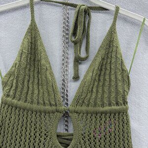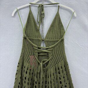 Stylish olive green mini dress. Features crochet design. Halter neck with tie closure. Perfect for casual outings.