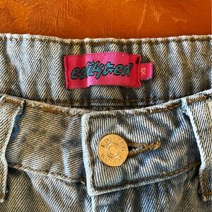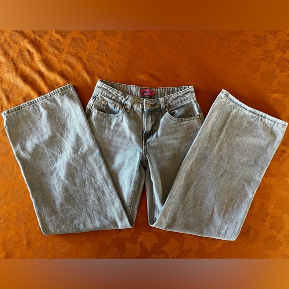 Trendy light blue denim jeans. Features a stylish button detail. Perfect for casual wear. Good condition. Size:XS