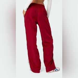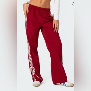 Elastic waist, polyester, ribbon tie ankle detail, track pants, model height 5’7, wearing size small