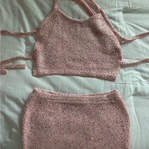 Edikted Sequin Pink Knit Tank Top and Skirt Set