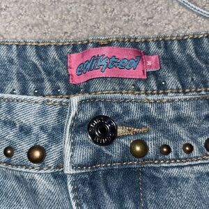 - studded washed denim lace up corset and studded low rise washed denim mini skirt