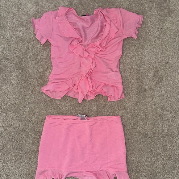 Chic pink ruffled top with matching skirt. Perfect for a stylish look.