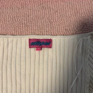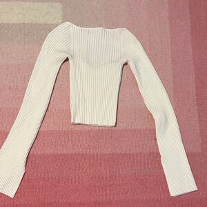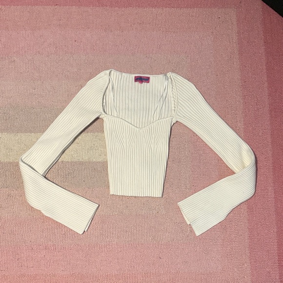 Chic white ribbed crop top. Features long sleeves and a sweetheart neckline. Perfect for casual outings. Super stretchy but still too small for me and I usually wear a medium. I’d say fits like a small