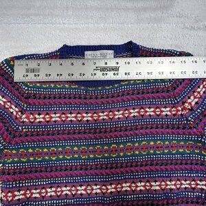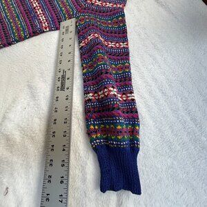 This rare Edina Ronay sweater features a stunning multicolor knit with intricate geometric and floral motifs, arranged in horizontal stripes across the body and sleeves. Crafted with care and hand-knit in England, it includes charming patch pockets, a crew neckline, and ribbed cuffs and hem for a cozy, structured fit. A true statement piece from a designer known for luxurious knitwear and vintage British style.