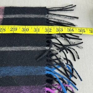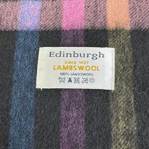 Edinburgh 100% Lambswool scarf. Purple, pink, tan, brown, black striped with fringe. Very soft.