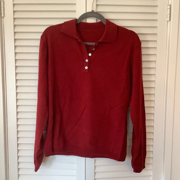 Edinburgh Woollen Mill women's cashmere sweater, size large (estimate, based on measurements below). Deep red color. Mother of pearl buttons. Collared like a polo shirt. Gently worn, in excellent used condition. Hardly any signs of wear.