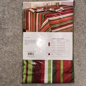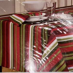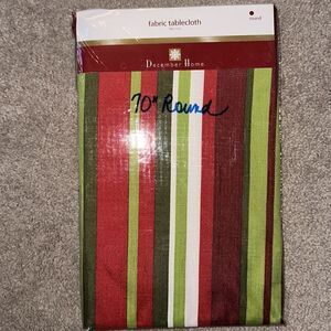 Bright cheerful Edison Holiday Stripe 70” round tablecloth from December home