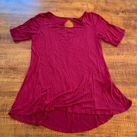 Short sleeve t-shirt with keyhole at back - Excellent Consition - 96% rayon, 4% spandex - color is wine - Brand tag is missing - Measures 16" pit to pit