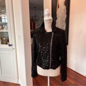 Elevate your style with this stunning black sequin jacket. Perfect for a night out, this jacket adds a touch of glamour to any outfit.
