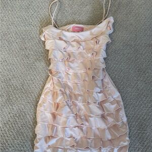 Chic mini dress with a soft pink hue. Ideal for stylish outings. One owner and in great conditions. No tears, holes or stains.