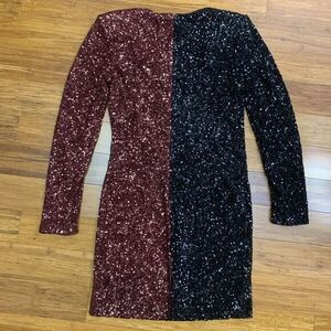 Stunning two-tone sequin dress featuring black and burgundy color blocking. Long sleeve design with V-neckline. Form-fitting silhouette that hits above the knee. Fully lined with a comfortable stretch fit. The dress is covered in all-over sequins that create a dazzling effect. Back zipper closure for easy wear. Shell is made of 95% polyester and 5% spandex with 100% polyester lining. The dress is in excellent condition with no missing sequins or damage.