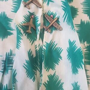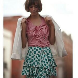 Anthropology edme' & esyllte tiered, ruffled mini with cute airplane charms on front ties. back zip, fully lined. 78% viscose, 22% Silk. Excellent condition.