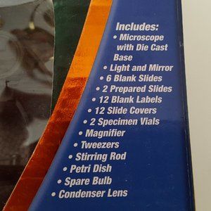 Pre-owned, in *AS IS CONDITION: *****NO LIGHTBULB, NO BATTERIES,ONE MISSING SLIDE COVER.***** NEEDS LIGHTBULB TO SEE INSIDE MICROSCOPE. ***MISSING/NOT INCLUDED ITEMS: Lightbulb (burned out one included for reference - but it does not work!), 1 slide cover, No batteries - 2 AA required - NOT INCLUDED. Directions included, but wrinkled/marker mark. Educ Science/Toys R Us. Original box shows shelf wear.See photos.