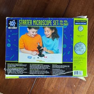 Explore the microscopic world with this science starter microscope set. Features a black and silver microscope with multiple magnification options. Includes essential lab accessories.