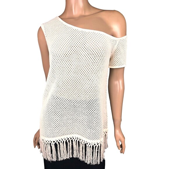 Edun size M Ecru Melange Tech Mesh One Shoulder Tank Top Open Weave Cotton/Nylon