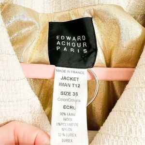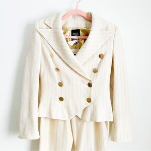 Edward Achour Paris Ivory Metallic Gold Stripe wool Tweed Double Breasted blazer and matching pant Suit Set. Not stretchy. Blazer is double breasted with metallic gold lining, Gold coin buttons. Slit at cuffs and shoulder pads built in.