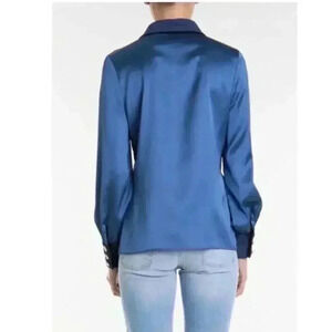 Edward Achour Paris Satin Button Up Shirt 44 Blouse Patch Pocket Metallic Button