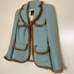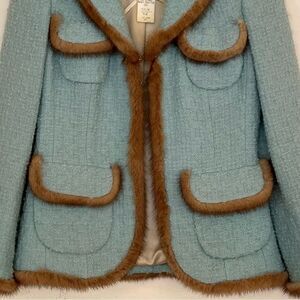 Edward Achour Paris Tweed Jacket Size 38 Mink Fur Trim Blue Made in France US 6