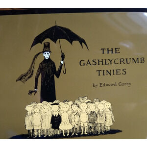 Features: The front of the lunchbox features the striking image of the skeletal figure with an umbrella and "THE GASHLYCRUMB TINIES by Edward Gorey." Each side of the lunchbox displays a portion of the alphabet, detailing the unfortunate fates of various children, such as "A is for AMY who fell down the stairs" and "Z is for ZILLAH who drank too much gin." The back has classic Gorey illustration of tombstones.