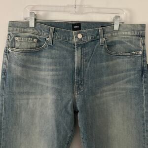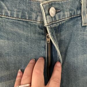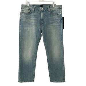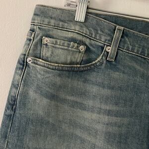 Features: Zipper/button fly, whiskering, crop length, 5 pocket design, light wash, straight leg, some distressing on hem and pockets