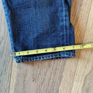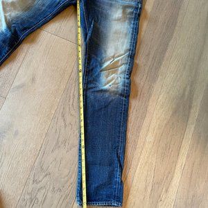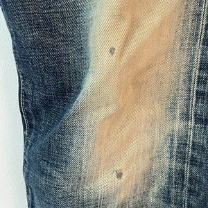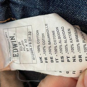 Edwin is my favorite brand of denim and I love these jeans but sadly I have gained a few pounds and the dream of wearing them is gone. They are in very good condition with no signs of intended wear and tear. The two black 'ink dots' on the left leg were there when I bought them so I believe them to be 'intended markings' (see photo).