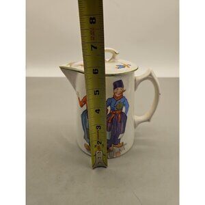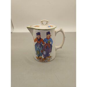 The product is a vintage semi-vitreous china pitcher by Edwin M. Knowles, featuring a white porcelain design with a Dutch Children theme. Made in the United States, this pitcher is perfect for serving coffee or tea in a charming and unique style. Its decorative design adds a touch of elegance to any dining or entertaining setting.