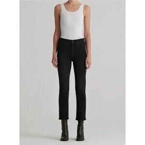 Features: high-rise, zip fly with button closure, 5-pocket design, belt loops, straight leg, ankle crop length, stretch denim, washed black, cotton/T400/Lycra
