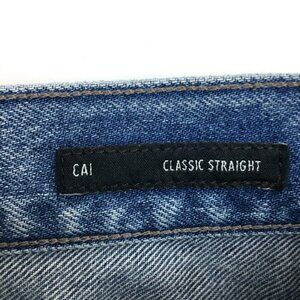 Description: Edwin women's Classic Straight Leg Jeans in good preowned condition; distressed, button fly