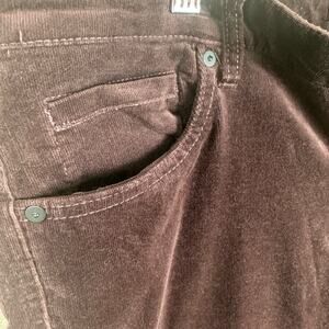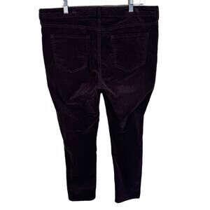 Excellent preowned condition. Dark burgundy skinny high rise corduroy pants. Zipper/button closure at waist. 5-pocket design. Cotton/spandex material. Approx. measurements: Waist 38", inseam 31", rise 11". Size 33. Close up pictures have distorted the color, truest color is first 2 pictures.