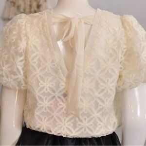 This cream blouse from Eesome features charming puff sleeves and a ruffled boxy silhouette, perfect for adding a touch of elegance to your wardrobe. The intricate lace overlay and light, airy fabric create a sophisticated look, ideal for both casual and formal occasions.