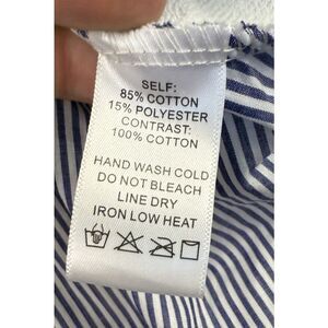 Features striped blue and white shirt-style fabric contrast at the hem, back, and cuffs for a layered look.