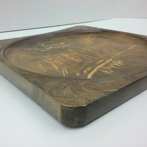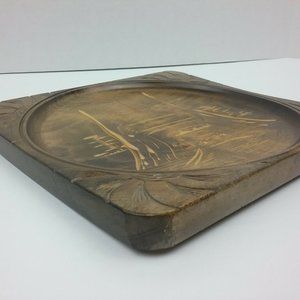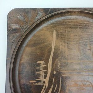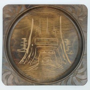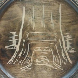 Efcco California Redwoods Drive Thru Tree Wood Plaque - Made in Japan. This is a vintage Efcco engraved wood plaque in overall good condition, with some signs of wear. There are some areas that show scuff marks and the glaze/finish at lower left side shows some slight crazing. This piece has a slight curve to it (I have included side angle photo). It does not sit completely flat, but I think this is the way it was made and not an imperfection. Please see all pictures for detail.