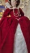 This elegant doll features a beautiful red velvet-like gown with white lace trim, a white underdress, and a pearl necklace. A wonderful addition for any doll collector.