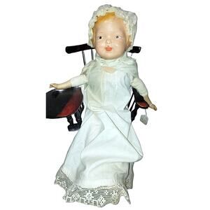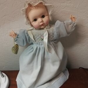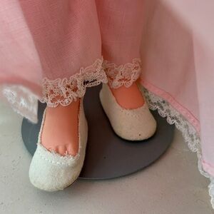 I collected these doll when I was a little girl in the 70s. She is adorable, but definitely has a dusty odor and faded clothing. I named my beloved collection so you will see “Sandra” written on her tag! She comes with her own stand