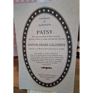 The Effanbee Holiday Patsy Durable Doll from 1999 is a licensed reproduction by Ashton Drake, featuring a brown painted hair, light complexion, and brown eyes. This vintage doll comes with a stand, purse, necklace, outfit, shoes, original box, and a Certificate of Authenticity. Patsy is a girl doll made of vinyl, signed by the artist, and is part of the Durable Dolls product line, making it a valuable addition to any doll collection.