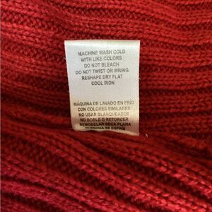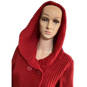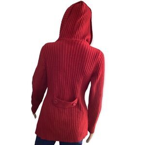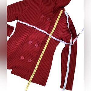Good preowned condition, deep red color, double breasted, medium knit, deep knit lines add texture, no pockets, back button strap accent, see pics for measurements for custom fit.