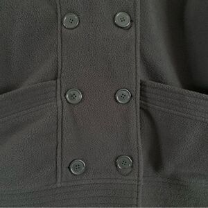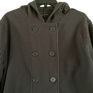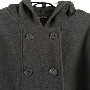 Cute charcoal gray fleece hooded winter jacket. Double button front. Knit sleeves. Front hand pockets. Machine washable polyester/acrylic fabric. In great preowned condition. Effeci Creazioni Size XL