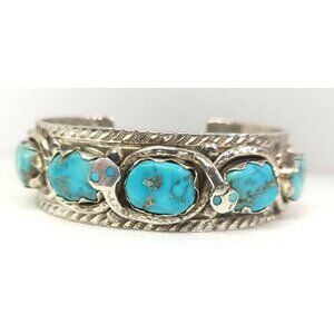 Effie C Zuni 925 Sterling Silver Turquoise Snake Cuff Bracelet 5 polished turquoise stones each 0.5" x 0.4" with two smaller ones in two snakes' heads. The details are unreal!